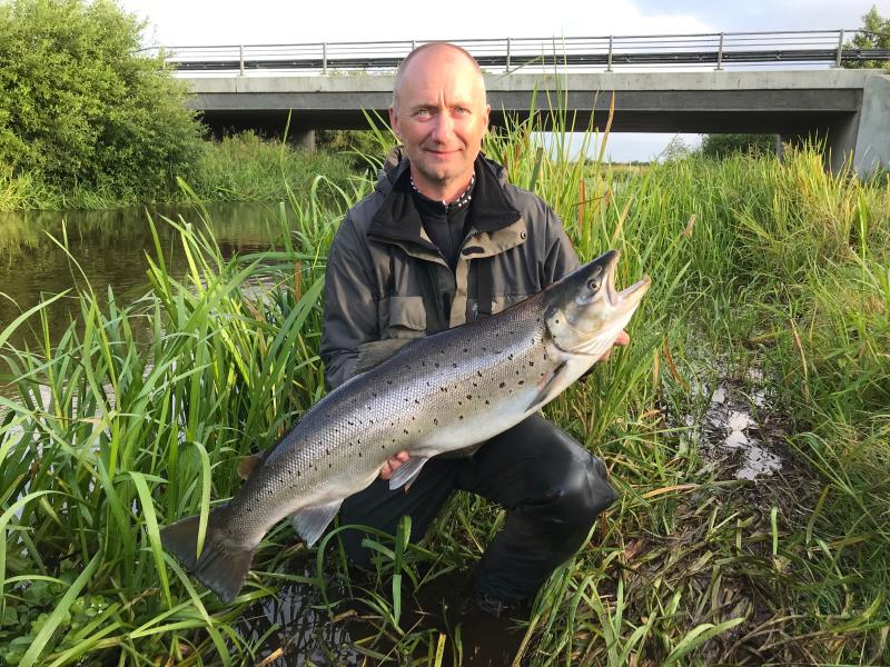 Vi kørte til nr. 44, hvor jeg startede oppe ved spangen og Lars midt på stykket. Jeg satte en kobberfarvet 28g pool blink på. Da jeg nåede ca. hvor Lars startede kom hugget idet blinket var inde ved egen bred og helt oppe i overfladen, jeg så at havørreden kom og tog blinket og den strøg midt ud i åen hvor den tog et voldsomt spring, jeg kunne se det var en god fisk så jeg råbte efter Lars der var kommet forbi Røjbæk. I mellem tiden tog den endnu et voldsomt spring, derefter et udløb opstrøms. Jeg fik den vendt da Lars kom ned til mig, vi gik nedstrøms med den hvor den tog nogle små udløb. Lige inden indgangen til Røjbæk viste den lidt træthed så jeg besluttede at nu skulle den landes, jeg fik den ind til bredden hvor Lars satte gaffen perfekt i den og trukket på land. Jeg fik gokket fisken og da jeg skulle afkroge den opdagede jeg at modhager på krogen var klemt ind (havde brugt blinket i Store Åen) Jeg målte den til 85 cm, og da vi ingen vægt havde med måtte det vente til vi kom hjem. Lars ville gerne fiske lidt mere så jeg gik op til bilen med fisken, men da jeg kom ned igen blev krogen dog skiftet ud .Vi fiskede en lille times tid endnu men der skete ikke mere, så vi kørte hjem for at fejre fangsten og få den vejet. Vægten stoppede på 8,3 kg. Det skulle lige skylles ned med et par Karup Å whisky og lidt rom, det var jo trods alt sommerferie.