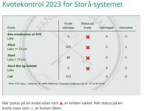Det er vigtigt at holde øje med om der stadig er laks til rådighed på den tildelte kvote, inden man begiver sig til Storåen på laksefiskeri. Dette er særdeles vigtigt hvis man ønsker mulighed for at hjembringe en laks. Man kan holde sig opdateret på SVS hjemmesiden: http://www.svstoraa.dk/ hvor man også skal foretage evt. fangstindrapportering, såfremt man er så heldig at fange en flot laks.